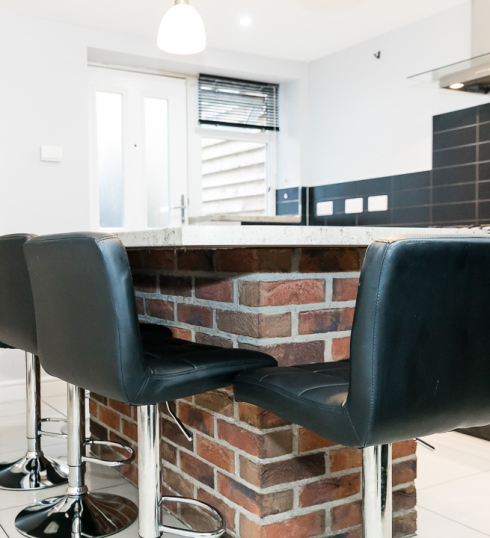 A central kitchen island with leather bar stools makes it a great space for socialising or enjoying meals together.
