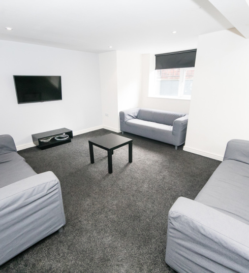The cosy living room features three cushioned sofas and a flat-screen TV—perfect for relaxing after lectures or catching up with housemates.