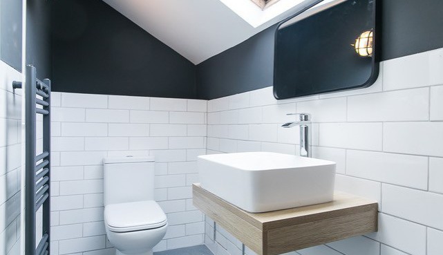 floor bathroom is a fully fitted wet room with the same sink and WC. Both have a mixture of modern cladding and white tiling, as well as modern anthracite towel rails.