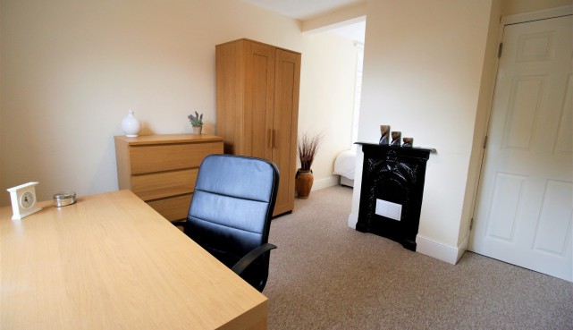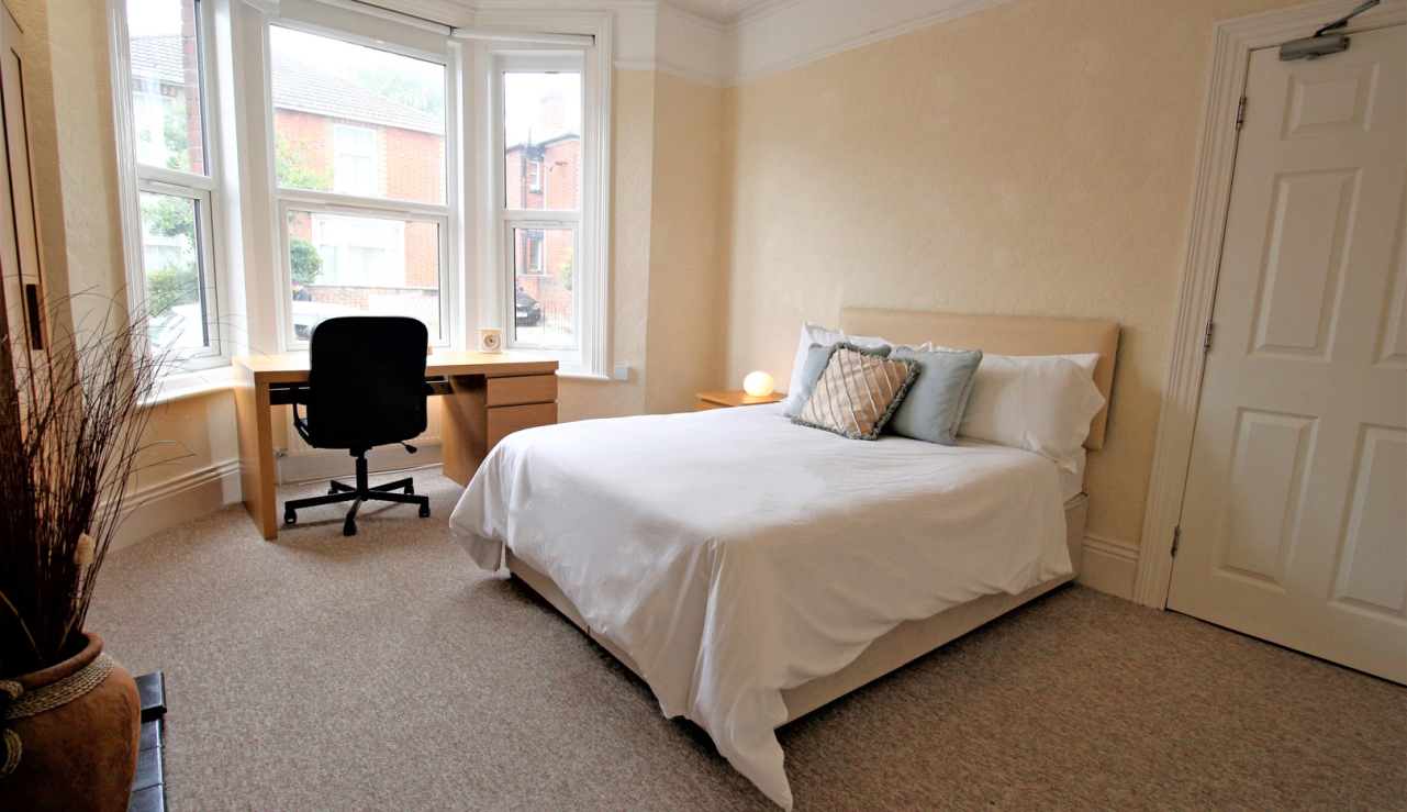 Each of the six double bedrooms is bright and airy, featuring modern furnishings including a wardrobe, chest of drawers, bedside table, desk, and chair. Stylish blinds and fitted carpets complete the contemporary look.