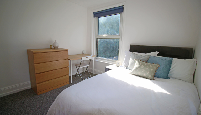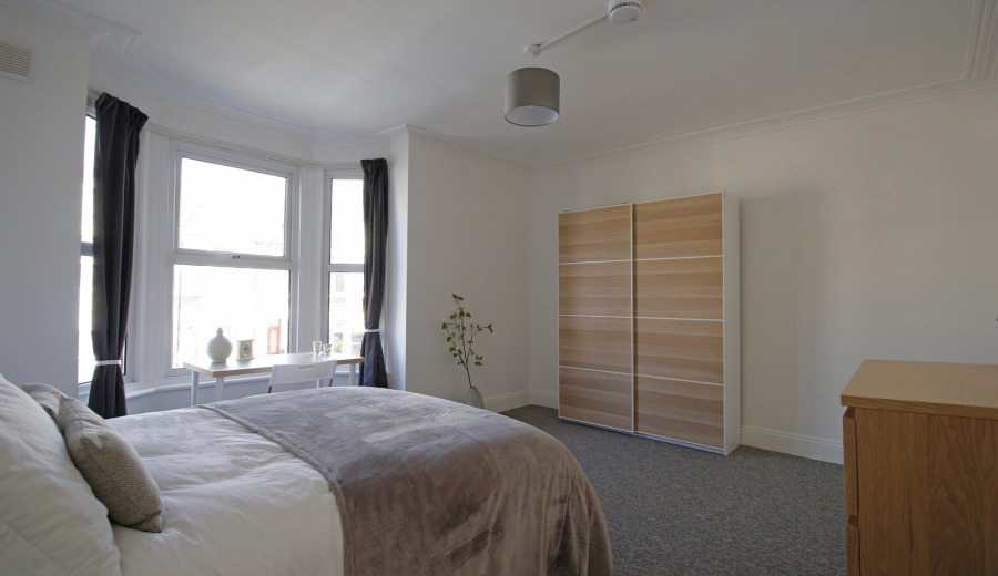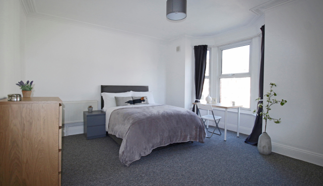 Spread across the ground and first floors, all bedrooms are spacious, bright, and thoughtfully designed. Each comes fully furnished with contemporary wardrobes, drawers, bedside tables, desks, chairs, and comfortable double beds. Stylish grey curtains and plush charcoal carpets add a sleek, modern finish.